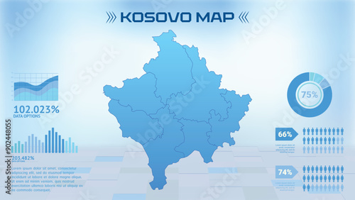 © bakarali, Fototapeta premium Blue Kosovo Flag Map with States, Political Kosovo Flag infographic map vector illustration