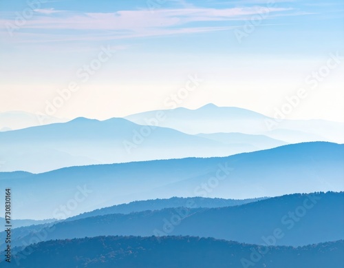 Obraz premium Blue layered mountain range landscape in morning fog.