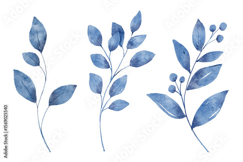 © Larisa, Obraz premium Blue leaves watercolor set. Hand painting floral illustration. Indigo leaf, plants, foliage, branches isolated on white background.