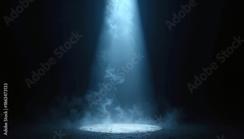 © Pete, Naklejka premium Blue light beam cuts through dark smoky space. Stage spotlight illuminates ground. Fog swirls around bright light source. Abstract atmosphere.
