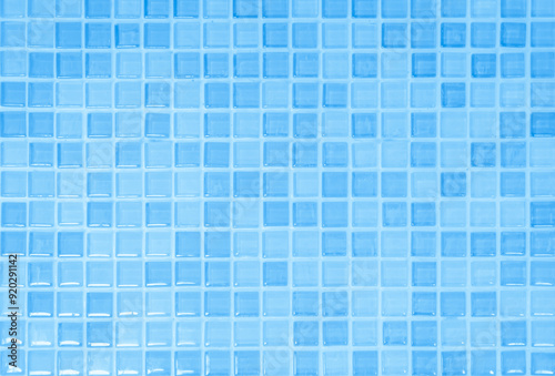 © Phokin, Fototapeta premium Blue light ceramic wall chequered and floor tiles mosaic background in bathroom. Design pattern geometric with grid wallpaper texture decoration pool. Simple seamless abstract surface clean.
