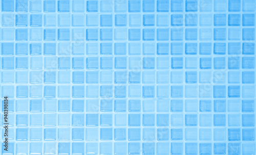 Fototapeta premium Blue light ceramic wall chequered and floor tiles mosaic background in bathroom. Design pattern geometric with grid wallpaper texture decoration pool. Simple seamless abstract surface clean.