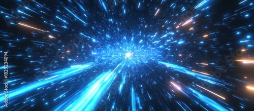 Obraz premium Blue light streaks through space, stars background, hyperspace travel
