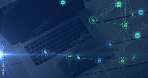 © vectorfusionart, Naklejka premium Blue light trail and network of digital icons against laptop on wooden table