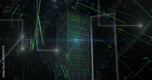 © vectorfusionart, Obraz premium Blue light trails and data processing over computer server against black background