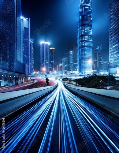 © Rindi, Fototapeta premium Blue Light Trails on City Street at Night.