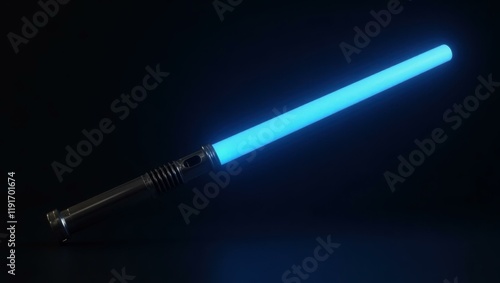 © PremiumPhoto, Naklejka premium Blue lightsaber on right. Soft yellow background. Copy space for text, 3D render AI Generated Designer Element