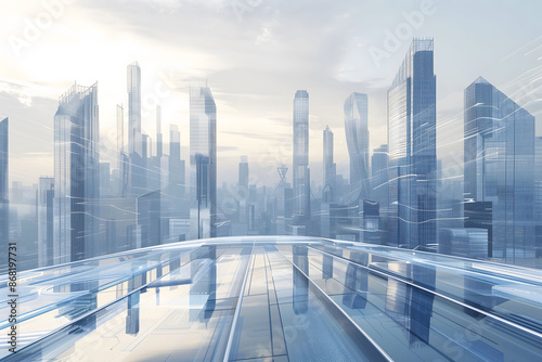 © Percy Lou, Fototapeta premium Blue lines and abstract curves in the foreground, a futuristic cityscape under a clear sky in the midground, glass buildings and skyscrapers in light colors provide a cityscape background