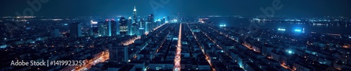 © กมลวรรณ เรือนศรี, Fototapeta premium Blue lines illuminate cityscape at night Aerial view , high, electric, lights