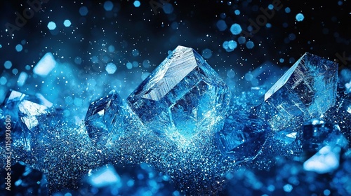Fototapeta premium Blue liquid surface with floating ice cubes, bubbles, and snowflakes