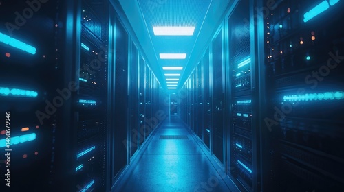 Fototapeta premium Blue-lit server banks in a symmetrical formation, great for cloud storage...