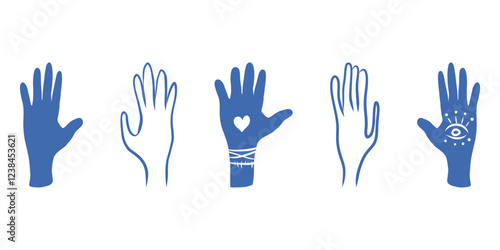 Fototapeta premium Blue magical hands set. Heart and eye. Esoteric and mystical design elements
