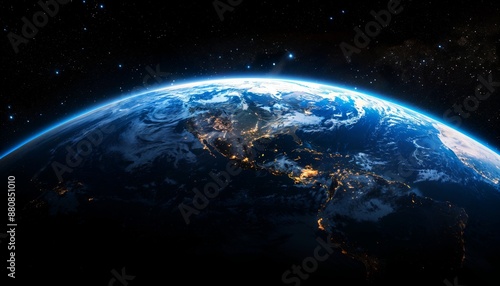 Obraz premium Blue marble Earth, a 3D sphere suspended in black space, orbits glowing sun, illuminated continents, oceans, and swirling atmosphere