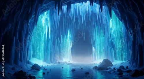 Fototapeta premium Blue Matrix Ice Cave Shimmering With Digital Codes