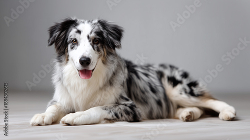 Fototapeta premium Blue merle collie dog lying on a floor and looking at the camera on a neutral...