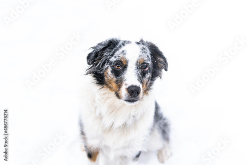 © Rachel, Fototapeta premium Blue Merle Miniature Australian Sheppard Dog Playing Outside in The Falling Snow