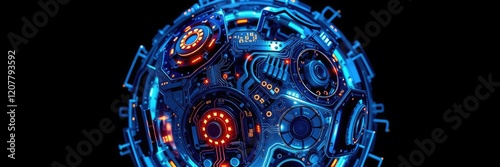 Fototapeta premium Blue metallic sphere with intricate details and glowing circuits, microchips,...