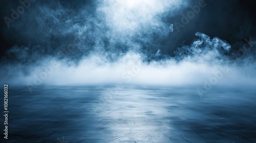 © Matt, Fototapeta premium Blue mist covering reflective surface in dark studio