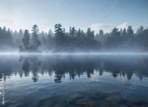 © AiGallery, Fototapeta premium Blue mist rising from the surface of a calm lake , surface, reflection