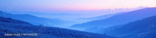 Fototapeta premium Blue mist swirls around rolling hills gentle terrain blending blue and purple...
