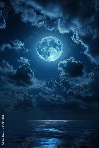 Fototapeta premium blue moon, full moon behind clouds, night time, night sky, blue light, cosmos, space, night, moon in the sky, close-up, astronomy, moon crescent, close-up, sky at night, night time, Generative AI