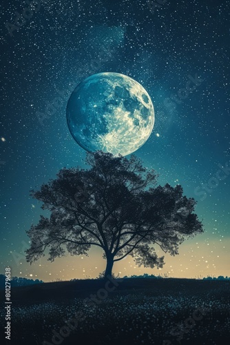© duyina1990, Fototapeta premium Blue Moon over Lonely Tree