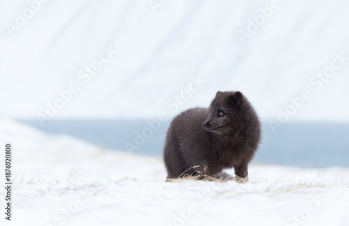 Fototapeta premium Blue morph Arctic fox walking in snow in Hornstrandir Nature Reserve