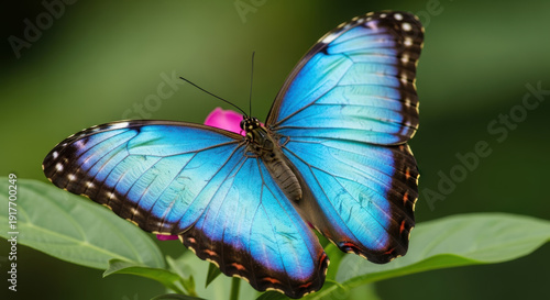 © Mikus, Obraz premium Blue Morpho Butterfly on Green Leaf