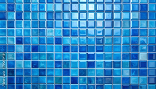 © Bobi, Fototapeta premium Blue mosaic tiles. Different shades, square shapes, and light reflection create a calming, textured surface