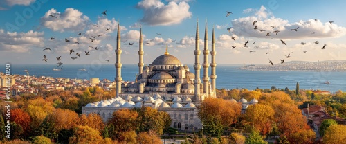 Obraz premium Blue Mosque in Istanbul, Turkey Surrounded by Autumn Trees and Birds in Flight