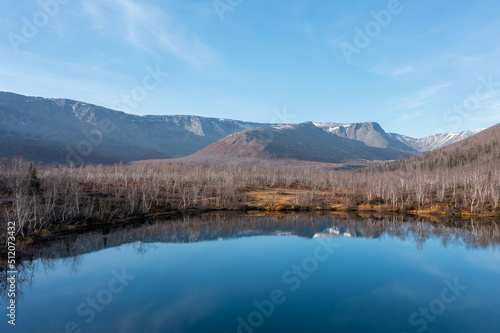 © Stanislav Samoylik, Fototapeta premium Blue mountain lake on the background snow-capped mountain picks in polar autumn. Landscapes of Northern Nature. Nature regions of Russia. Russian north.