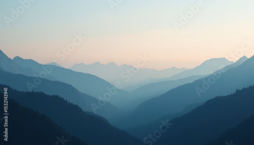 © DhanaStudio, Obraz premium Blue mountain range with layered peaks against a soft gradient sky.