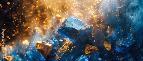 © Inai, Fototapeta premium Blue, navy stone,crystals. Textured background with sparkling particles, golden shimmer, lights. Diamond, gevel illustration. Generative ai.