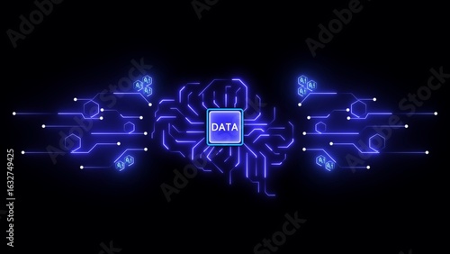 Obraz premium Blue Neon Brain Circuitry with Data Chip artificial intelligence