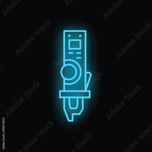© ylivdesign, Obraz premium Blue neon icon of a tattoo machine glowing on a black background