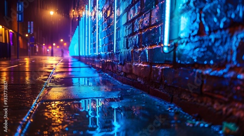 © Farid, Obraz premium blue neon light on a brick wall at night.
