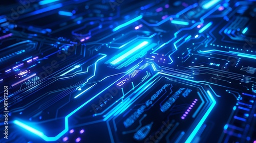 © Ailee Tian, Obraz premium Blue neon lights, lines, technological dark background.