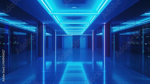 © Imsuniyah, Fototapeta premium Blue Neon Lit Hallway with Glass Doors Leading to Servers