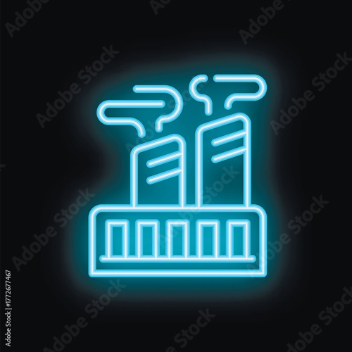 © ylivdesign, Fototapeta premium Blue neon style vector icon of a factory emitting smoke pollution on a black background