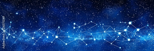 © Ilja, Fototapeta premium Blue Network Constellation on Starry Sky Connecting Distant Points with Lines and Glowing Dots