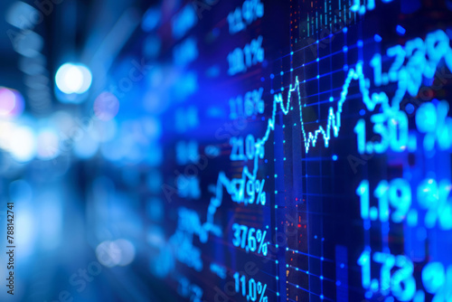 © Duka Mer, Obraz premium Blue numbers and data in motion on the right side represent stock market trends.