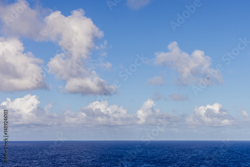 © edb3_16, Fototapeta premium Blue Ocean Horizon Under a Vibrant Sky with Fluffy White Clouds
