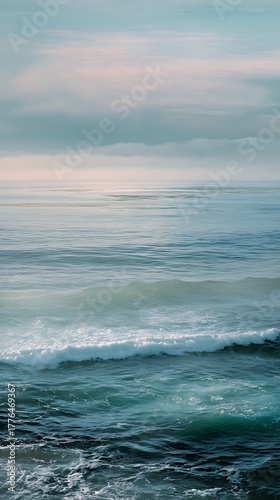 Fototapeta premium Blue ocean water with foamy waves under a calm cloudy sky horizon.