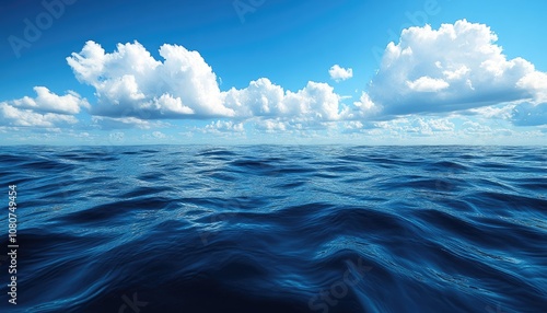 © Foxeye AI, Obraz premium Blue ocean with white clouds. A serene seascape with calm blue waves.