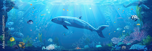 Naklejka premium Blue Oceanic: An aquatic-themed background features soothing blues and sea life decor, perfect for a marine biology or environmental studies classroom.