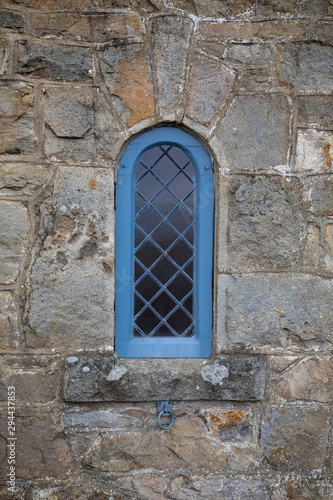 © Tina Jenner, Obraz premium Blue Old Window and Stone Wall