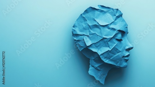 © Artyom, Obraz premium Blue paper abstract sculpture of human head on blue background