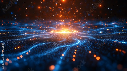 © banyu bening, Obraz premium Blue particle wave energy glow, dark background, digital art, website banner