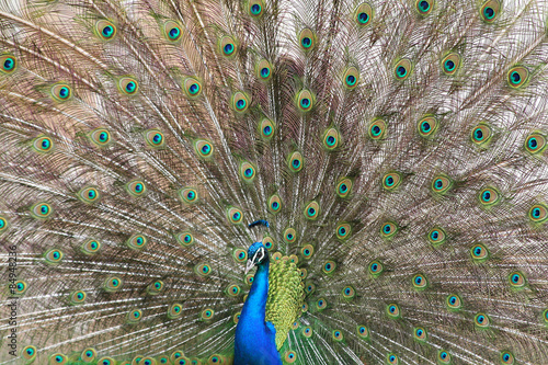 Obraz premium Blue peacock (Pavo cristatus) displays his colorful tail feathers