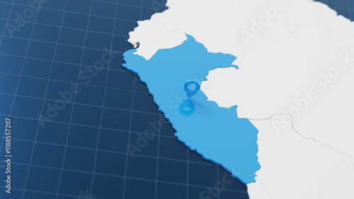 Fototapeta premium Blue Peru 3d map with pointer pin surrounded with other countries in white....